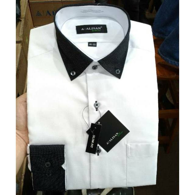 Penawaran Murah READY STOK BEST SELLER Kemeja Pria Alisan Slimfit Putih Dobby Ulir Miring Kerah Hitam TERBAGUS sayang jika tidak diamankan