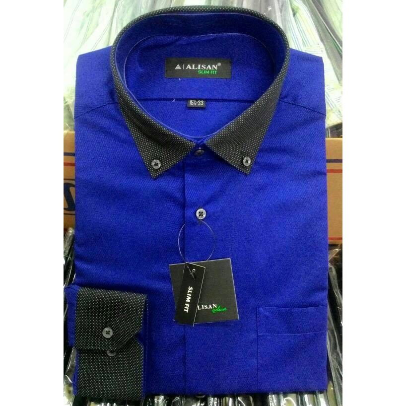Promo MurahRaih sekarang\n Kemeja Pria Alisan Biru Elektrik Ulir Miring Dobby Kerah Hitam SLIMFIT sebaiknya dibeli