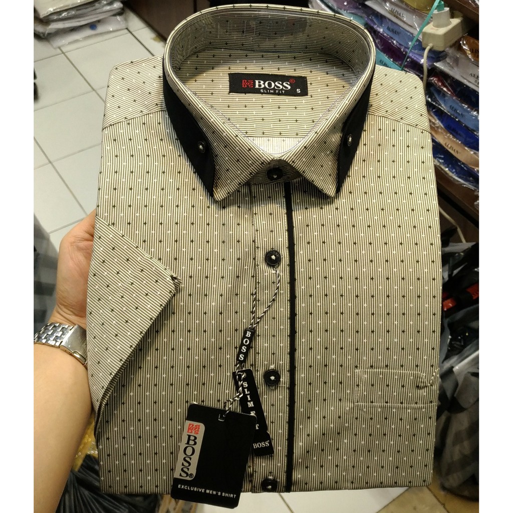 Penawaran Murah TERBARU & TERLARIS Kemeja Pria Boss Pendek Slimfit Casual Bintik Katun Abu Coklat KEKINIAN sayang jika tidak dibeli