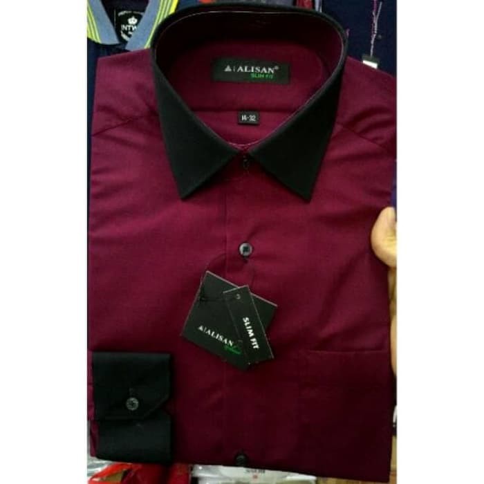 Penjual Produk Aman Kemeja Pria Alisan Panjang Slimfit Merah Maroon Kerah Hitam Hot Sale
